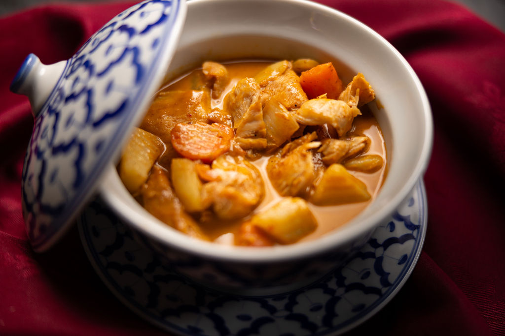 Chicken or beef fried with potatoes, carrot, peanuts and red curry in coconut milk
