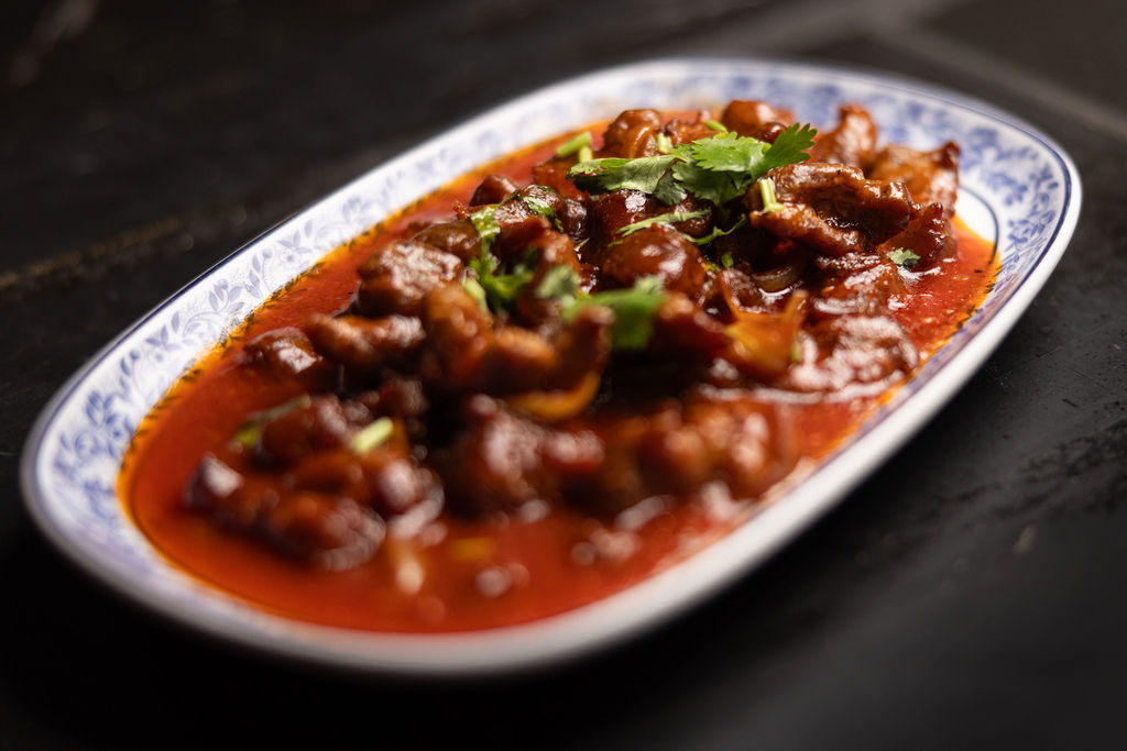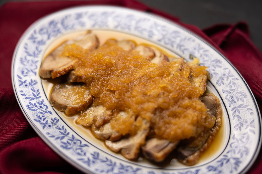 Pandestegte skiver af nakkefilet med hvidløg, chili, løg, forårsløg i soya- og østerssauce