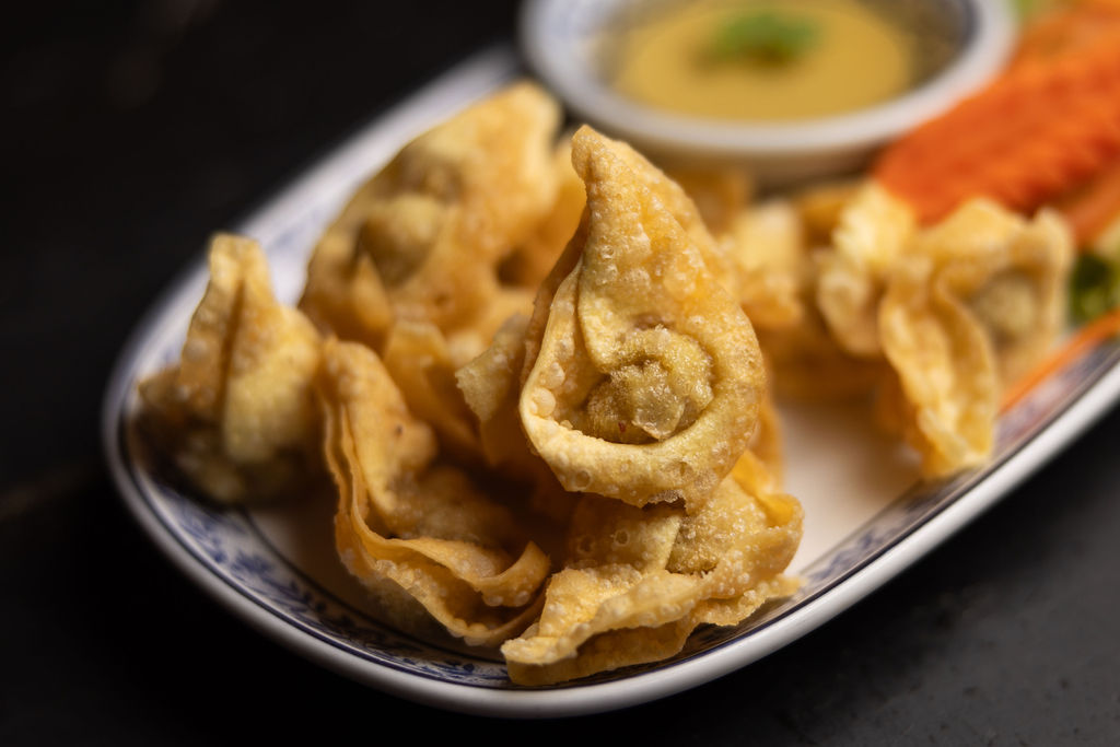 Deep fried minced pork in wonton pastry served with sweet palmsauce