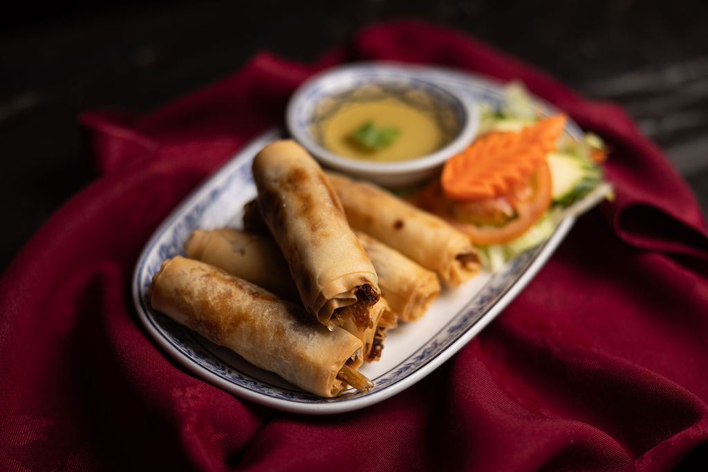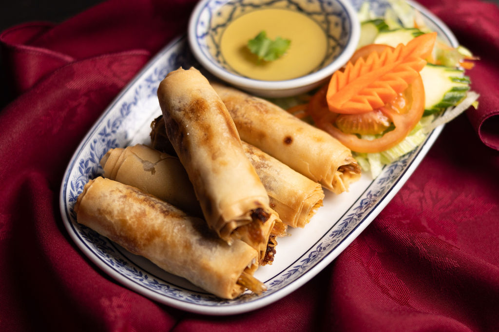 Homemade Chinese spring rolls with chopped pork, glass noodle and vegetables, served with sweet palmsauce