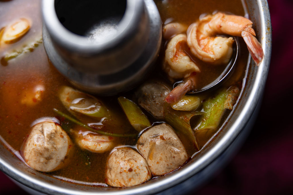 Stærk krydret thai rejesuppe med kongerejer, chili, lemon juice, koriander, forårsløg og champignoner