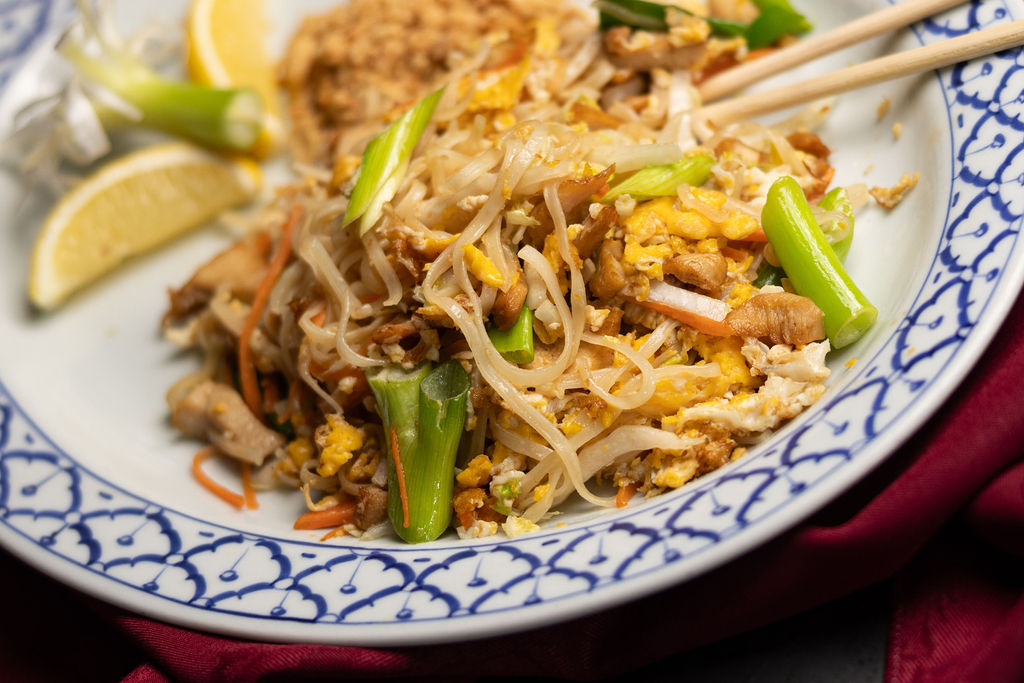 Ægnudler stegt med kongerejer og kylling, sukkerærter, kinesiske svampe og forårsløg