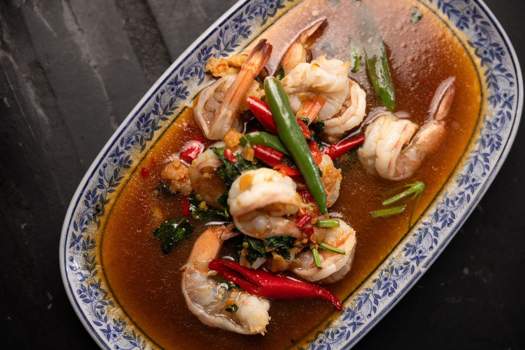 Pan fried king prawns with sweet basil, chili and garlic in soya- and oyster sauce