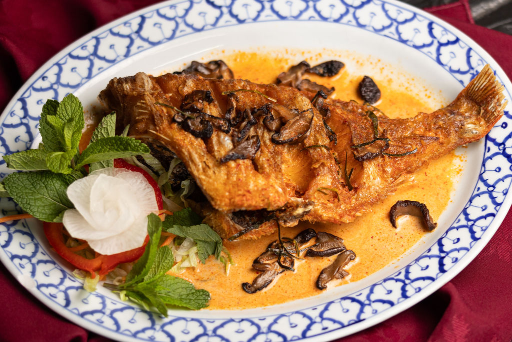 Redfish in green curry with aubergine, basil, bamboo and lemon leaves in coconut milk