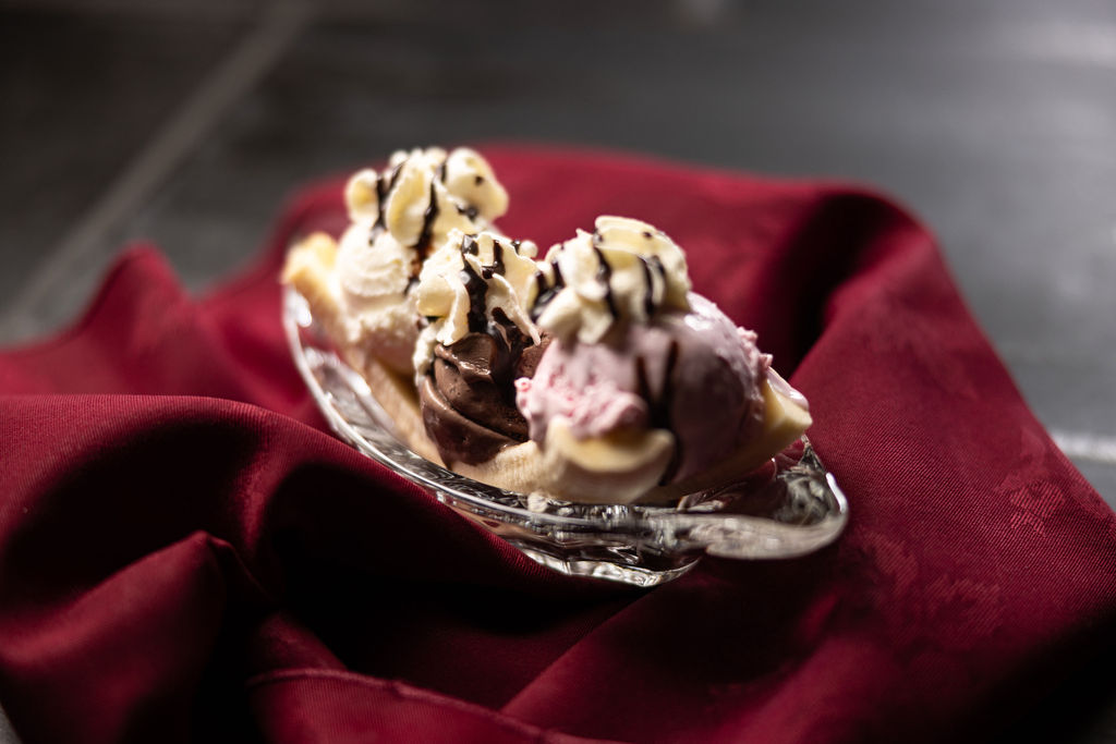 Vanilla, chocolate and strawberry ice cream, whipped cream and chocolate sauce