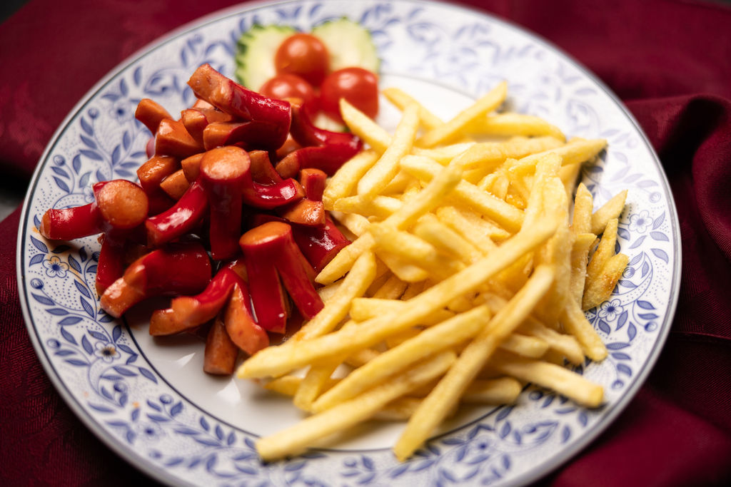 Stegte ris med æg, rosiner og grøntsager serveret med pølser og kylling