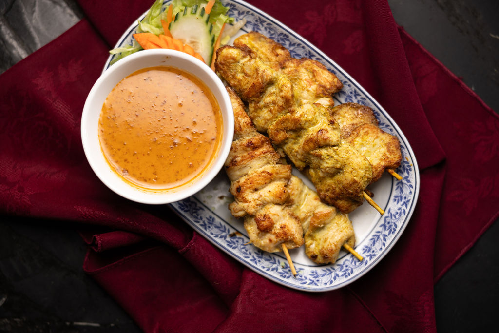 Slices of fillet of beef on Thai spear. Served with peanutsauce
