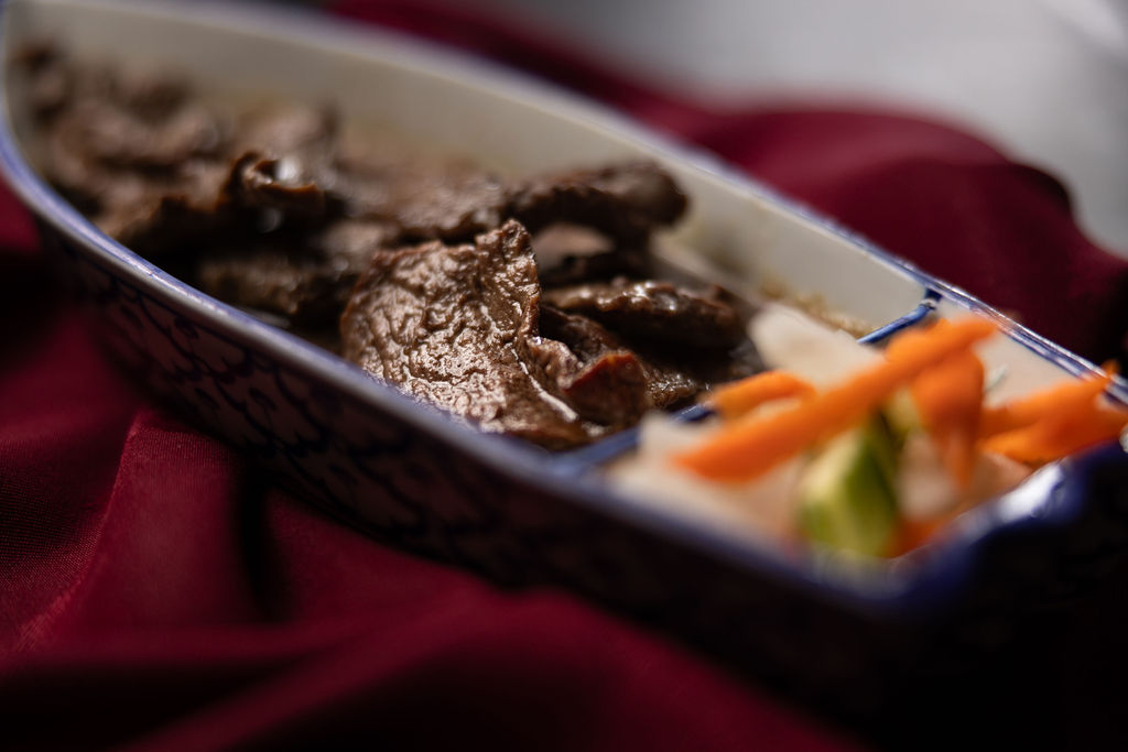 Thin slices of tenderloin, gently marinated in Mekong whisky, served with two variations of sauce and salad. Fry your own meat on a special barbeque pan
