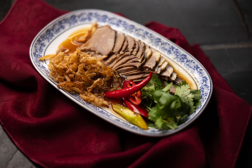 Skiver af oksemørbrad med sød basilikum, chili og hvidløg i soya- og østerssauce