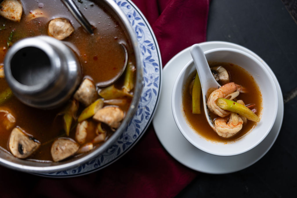 Stærk krydret thai rejesuppe med kongerejer, chili, lemon juice, koriander, forårsløg og champignoner