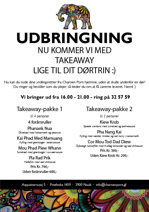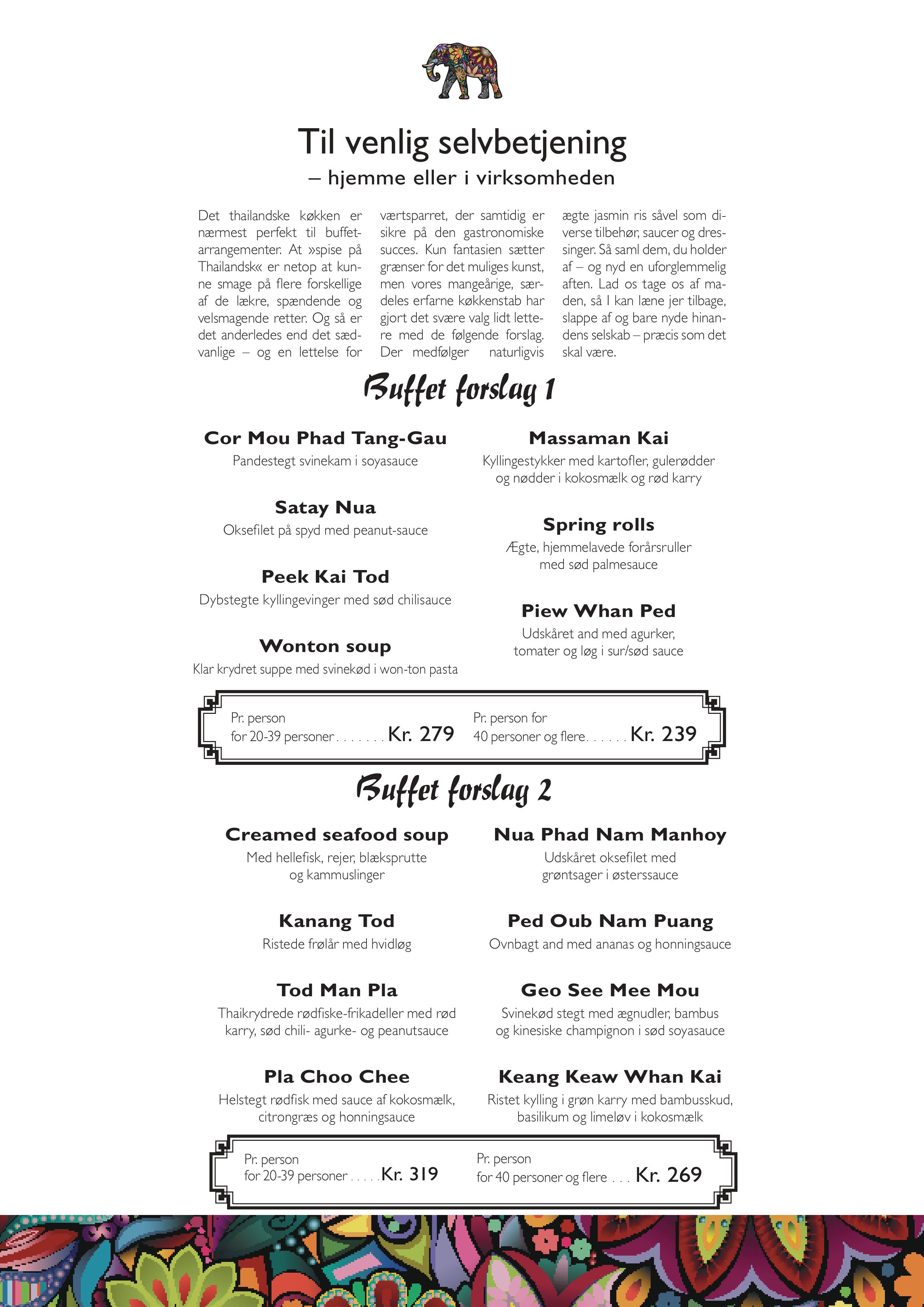 Vi har aktuelt to take-away pakker (se indhold herunder), men du er naturligvis også velkommen til at bestille fra kortet. Du kan også bestille buffet ud af huset til større selskaber – se vores aktuelle tilbud herunder: